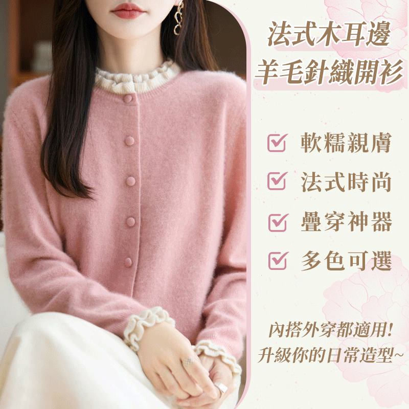 【法式木耳邊羊毛針織開衫】100%澳洲羊毛絨,減齡穿搭,活力滿滿,不挑身材,輕鬆遮肉,修飾身型,做功精細,不起球,不掉色,不變形